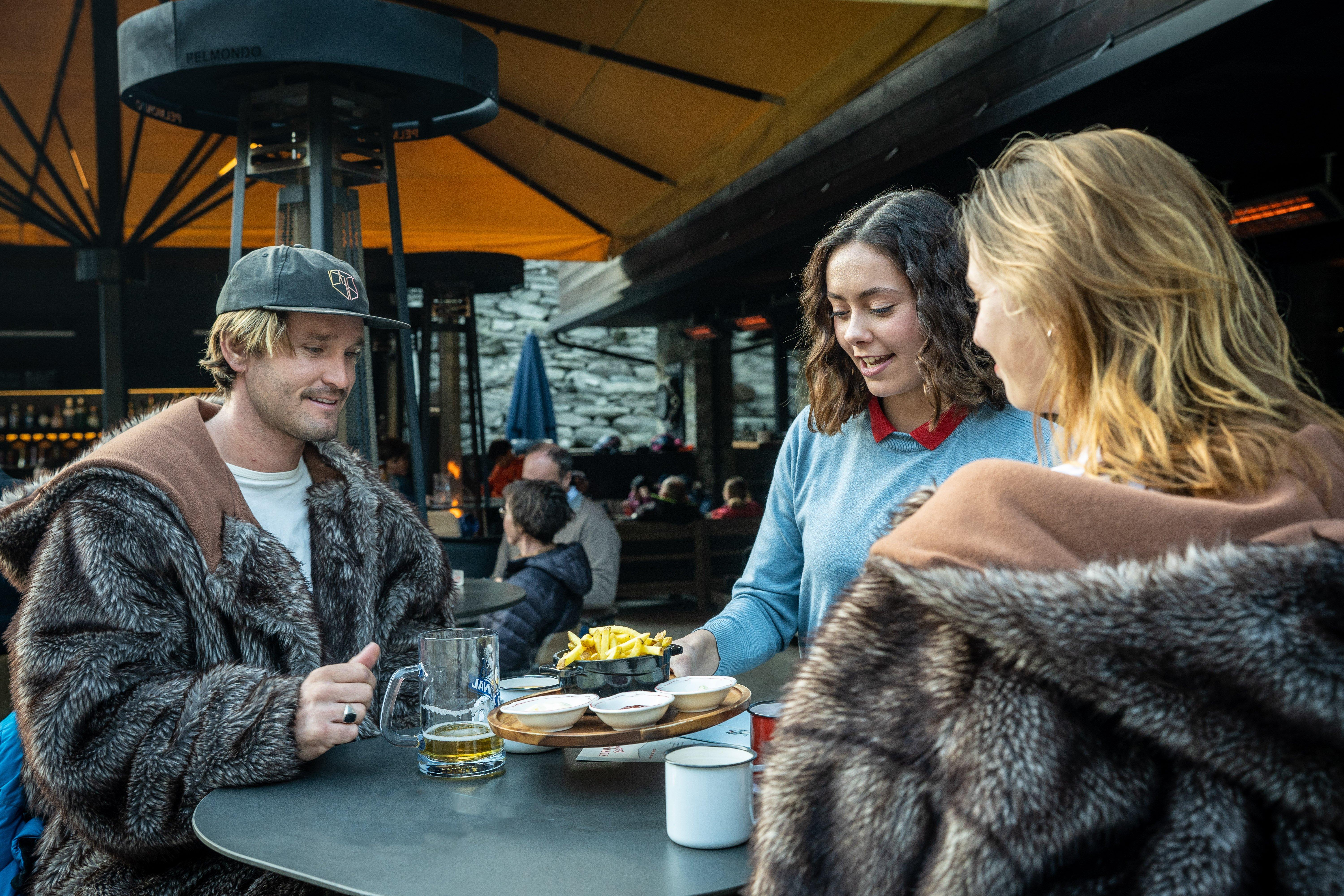 Dank Heizstrahlern bleibt es immer schön warm, während du die verschneite Bergkulisse bewunderst und dir etwas richtig Gutes gönnst. Feinsten Champagner, ausgewählte Weine, Hot Drinks for cool people und feine Snacks sind natürlich mit am Start. Mama kennt eben die perfekte Mischung aus Genuss und good vibes.