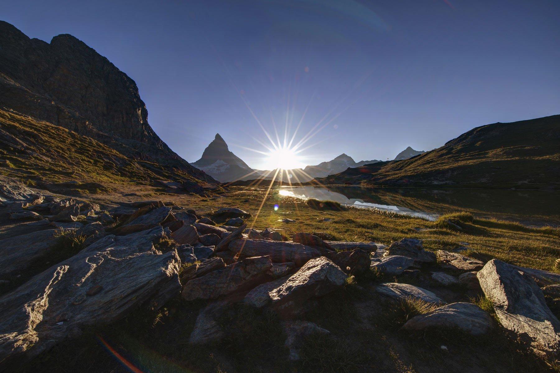 Der Riffelsee liegt etwas abseits der grossen Wanderwege von Zermatt, jedoch führt der Riffelseeweg (Nr. 21) direkt zu ihm. Der Blick auf das Matterhorn, den Berg der Berge, der alleine am Horizont steht, ist überwältigend. Über ihm nur das Universum – diesen Ausblick vergisst man nie. Windstille und damit flache Wasseroberfläche herrscht vor allem am Morgen früh und am Abend spät.