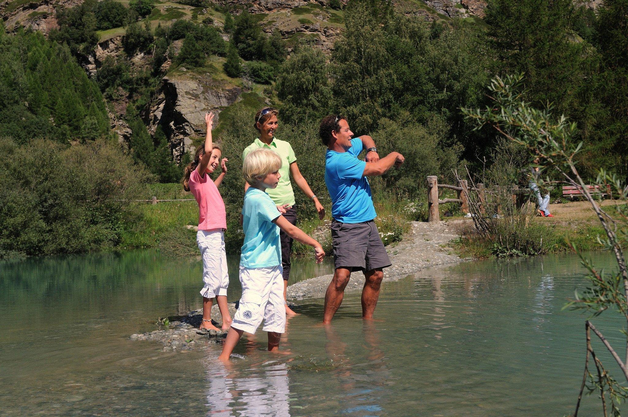 Der Rundweg führt durch unterschiedliches Gelände. Entlang dem Golfplatz Täsch-Randa. An Feuerstellen und Spielplätzen vorbei. Der ideale Auslauf für die ganze Familie. Die Zeit geht im Nu vorbei, denn auch das Bad im Schalisee lockt.